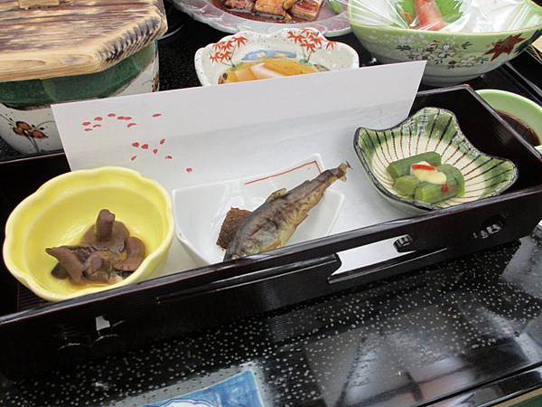 左起涼伴香茹、香煎香魚(滿滿的魚卵)、蔬菜