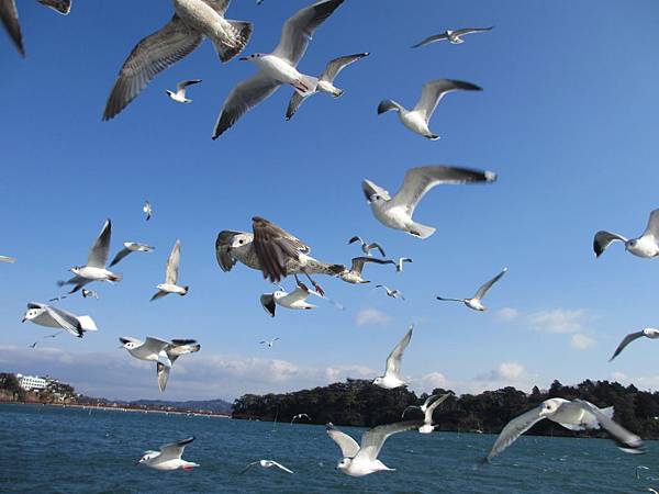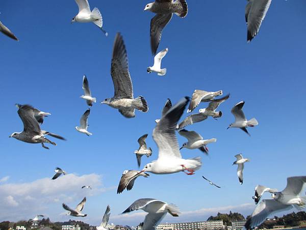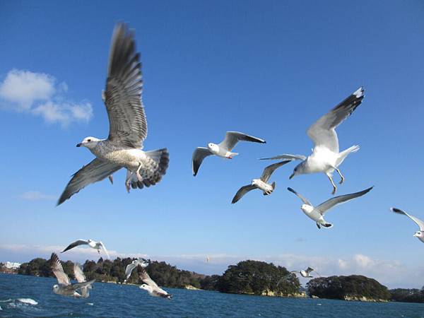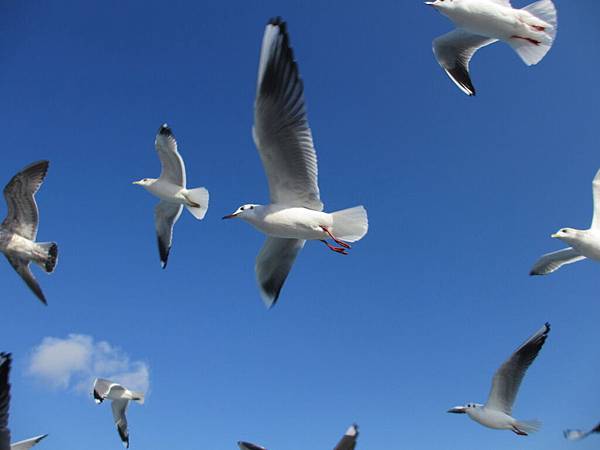 看到這群海鷗在藍天和海水中飛翔