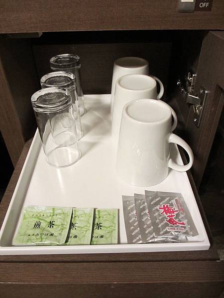 桌子底下除了有冰箱還有放置杯子、茶包的小地方