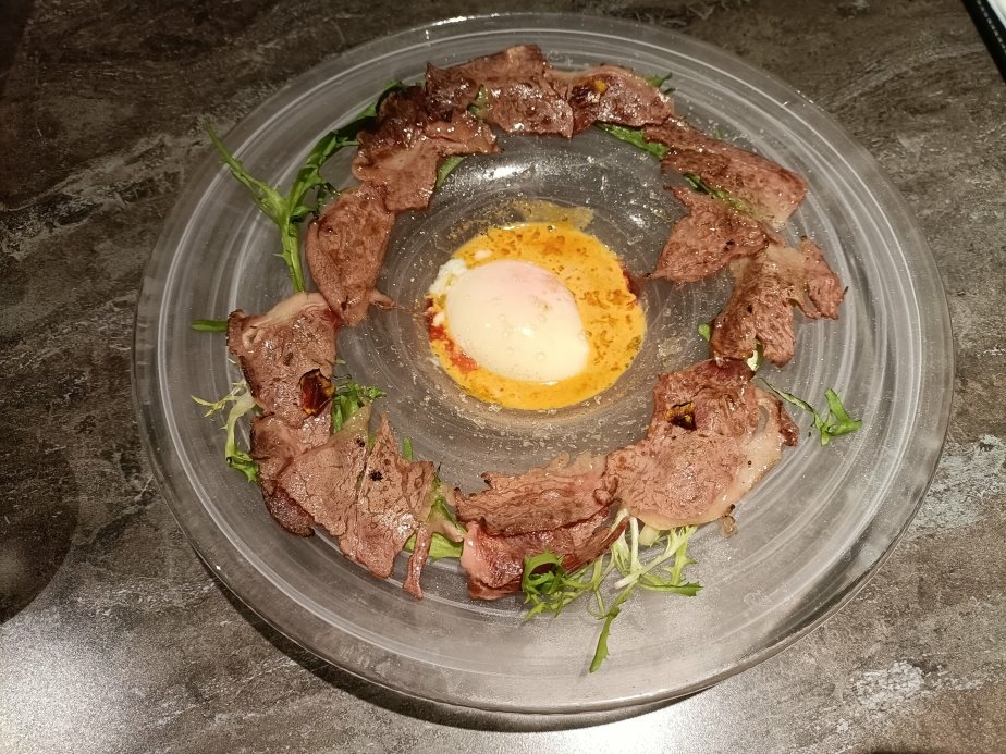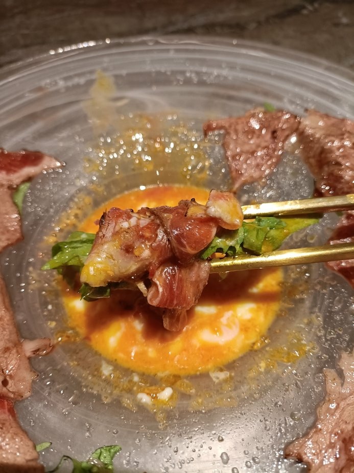 用炙燒過的牛肉片沾著蛋醬吃