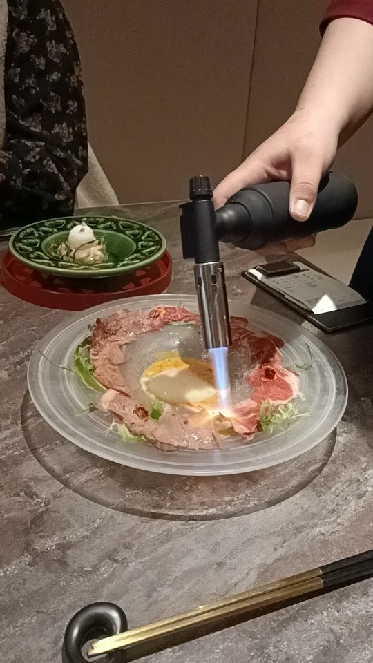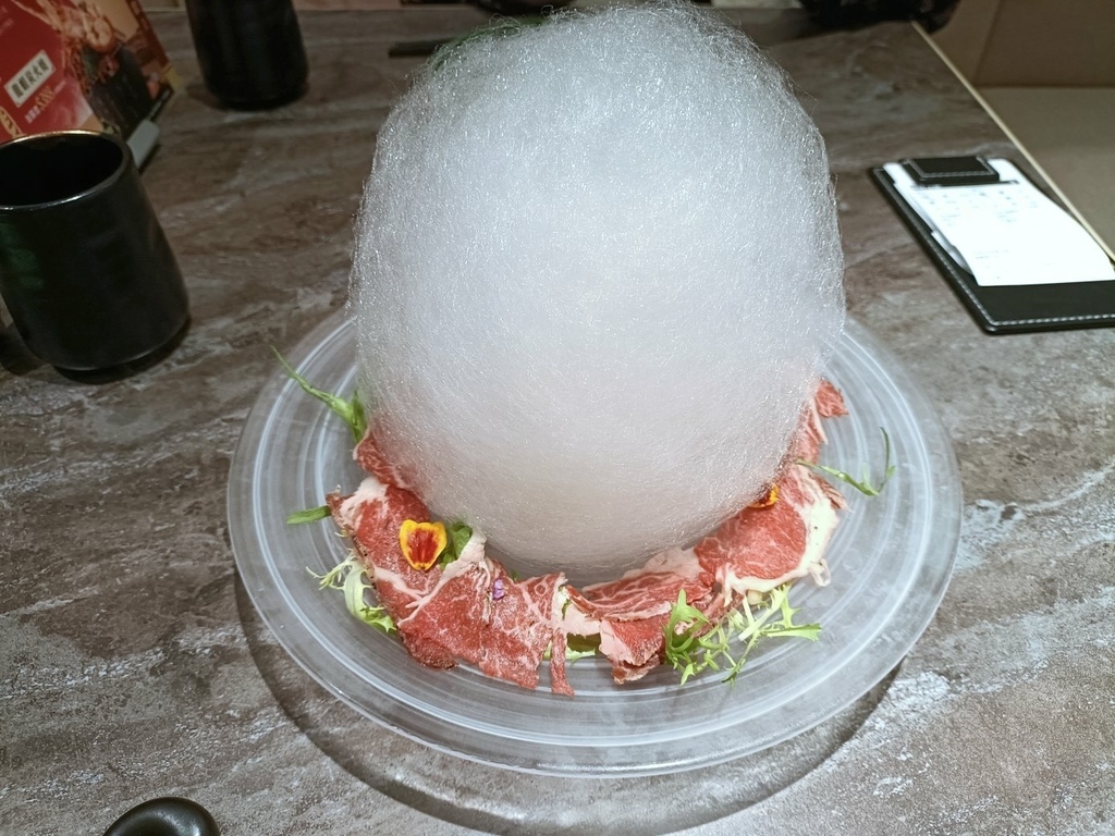 在桌邊融化那團棉花糖,順道炙燒盤邊的和牛片