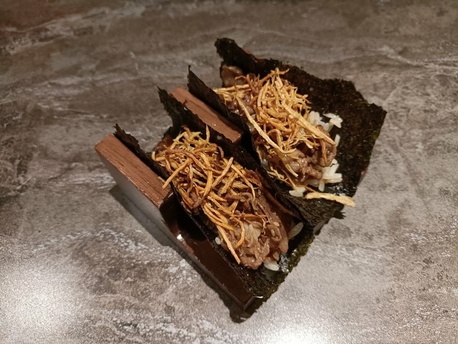 將和牛及炸牛蒡,以海苔裹住