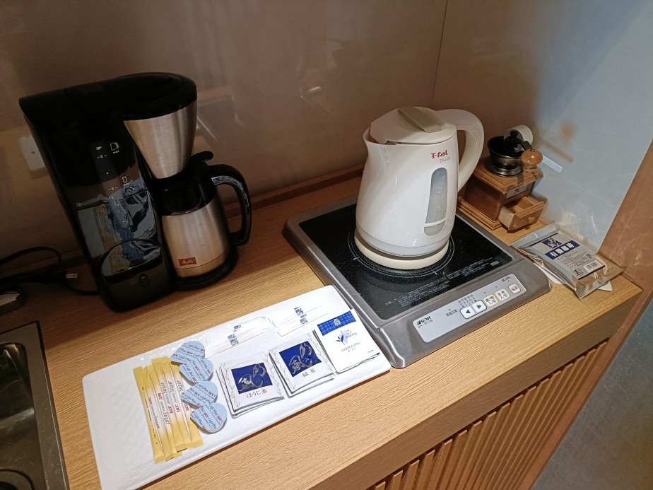 有茶包、咖啡、咖啡機、熱水壺、電磁爐