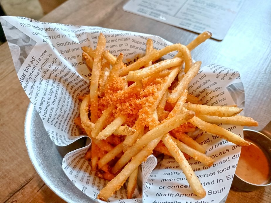 薯條細到如牙籤炸到超酥脆,灑上店家特製的粉紅雪花霜