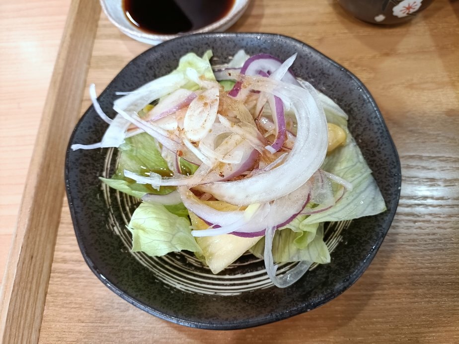 沙拉用的是酸甜和風醬,除了生菜、洋蔥、玉米外還有芭樂和鳳梨喔!