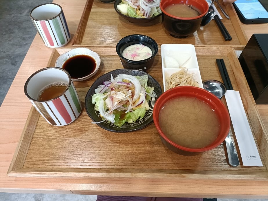 定食內含有:湯、沙拉、手捲、茶碗蒸