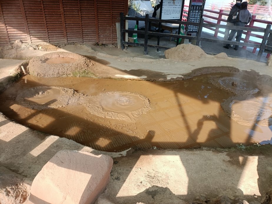 溫泉底部的熱泥是岩盤在地熱環境下混合以各類稠狀粘土融合而成,因此溫泉呈茶褐色