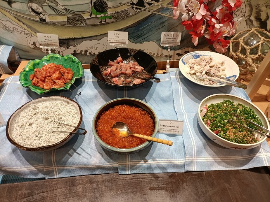 蔥花鮪魚/湯煮烏賊/鮪魚/鮭魚卵/明太子/吻仔魚