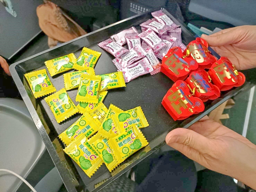 空服人員送上糖果,迎合新年新氣象